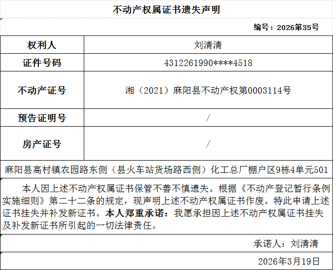 刘清清不动产权属证书遗失声明 麻阳苗族自治县人民政府 http://www.mayang.gov.cn 发布时间: 2026-03-19 16:12 【字体:大 小】 分享到 来源:麻阳县自然资源局 作者: