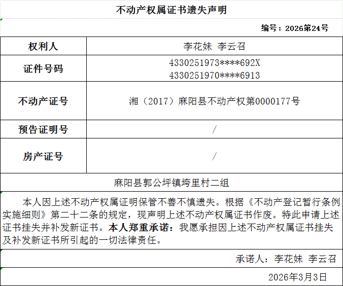 不动产权属证书遗失声明(李花妹 李云召) 麻阳苗族自治县人民政府 http://www.mayang.gov.cn 发布时间: 2026-03-03 15:50 【字体:大 小】 分享到 来源:麻阳县自然资源局 作者: