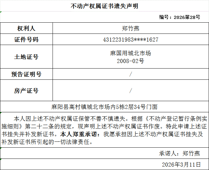 不动产权属证书遗失声明(郑竹燕) 麻阳苗族自治县人民政府 http://www.mayang.gov.cn 发布时间: 2026-03-12 15:02 【字体:大 小】 分享到 来源:麻阳县自然资源局 作者: