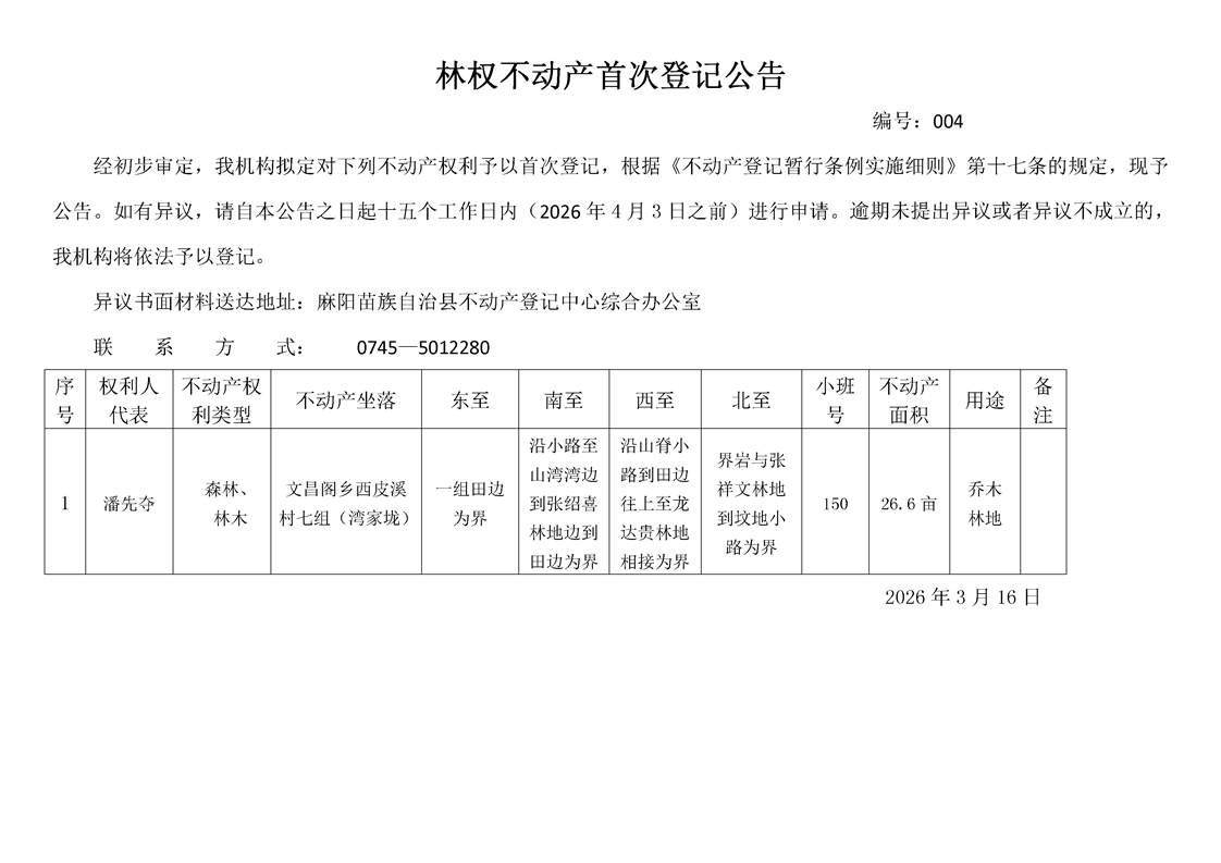 林权不动产首次登记公告(潘先夺) 麻阳苗族自治县人民政府 http://www.mayang.gov.cn 发布时间: 2026-03-16 15:32 【字体:大 小】 分享到 来源:麻阳县自然资源局 作者: