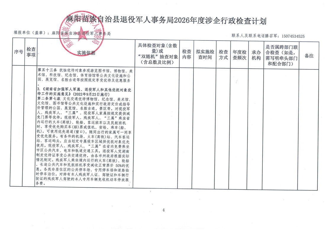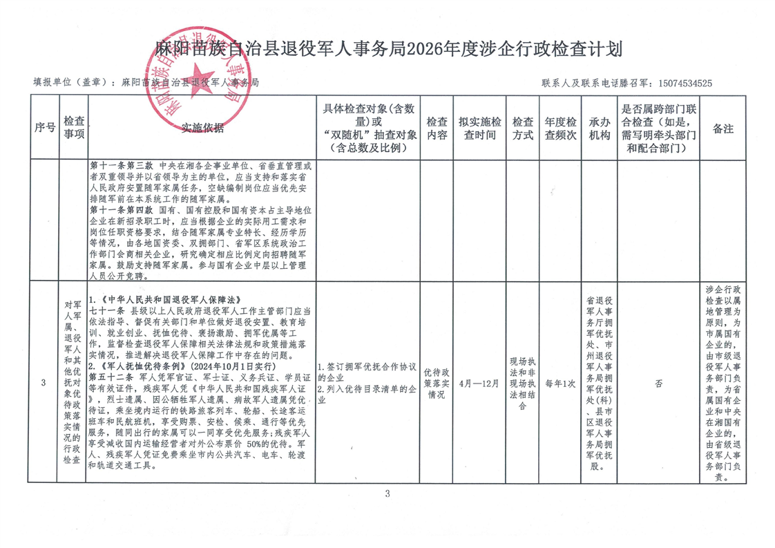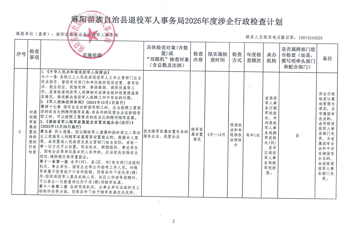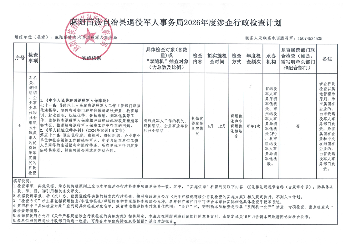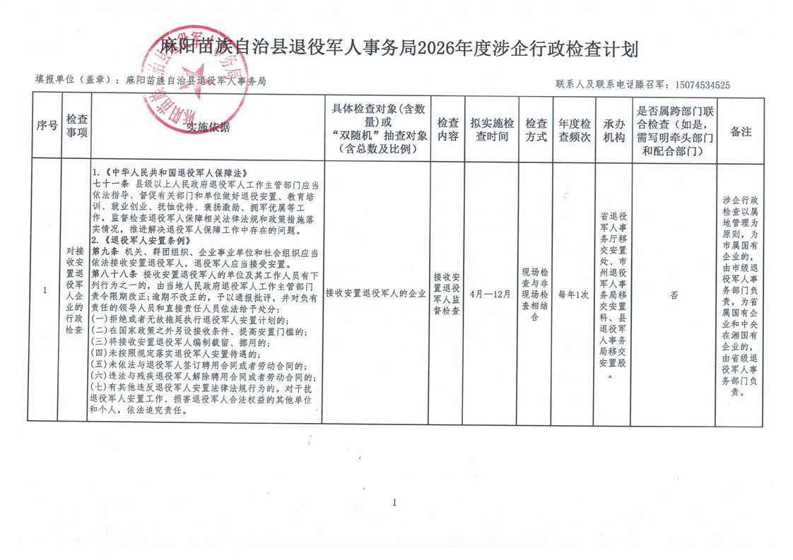 麻阳苗族自治县退役军人事务局2026年度涉企行政检查计划 麻阳苗族自治县人民政府 http://www.mayang.gov.cn 发布时间: 2026-03-18 16:01 【字体:大 小】 分享到 来源:麻阳苗族自治县退役军人事务局 作者:
