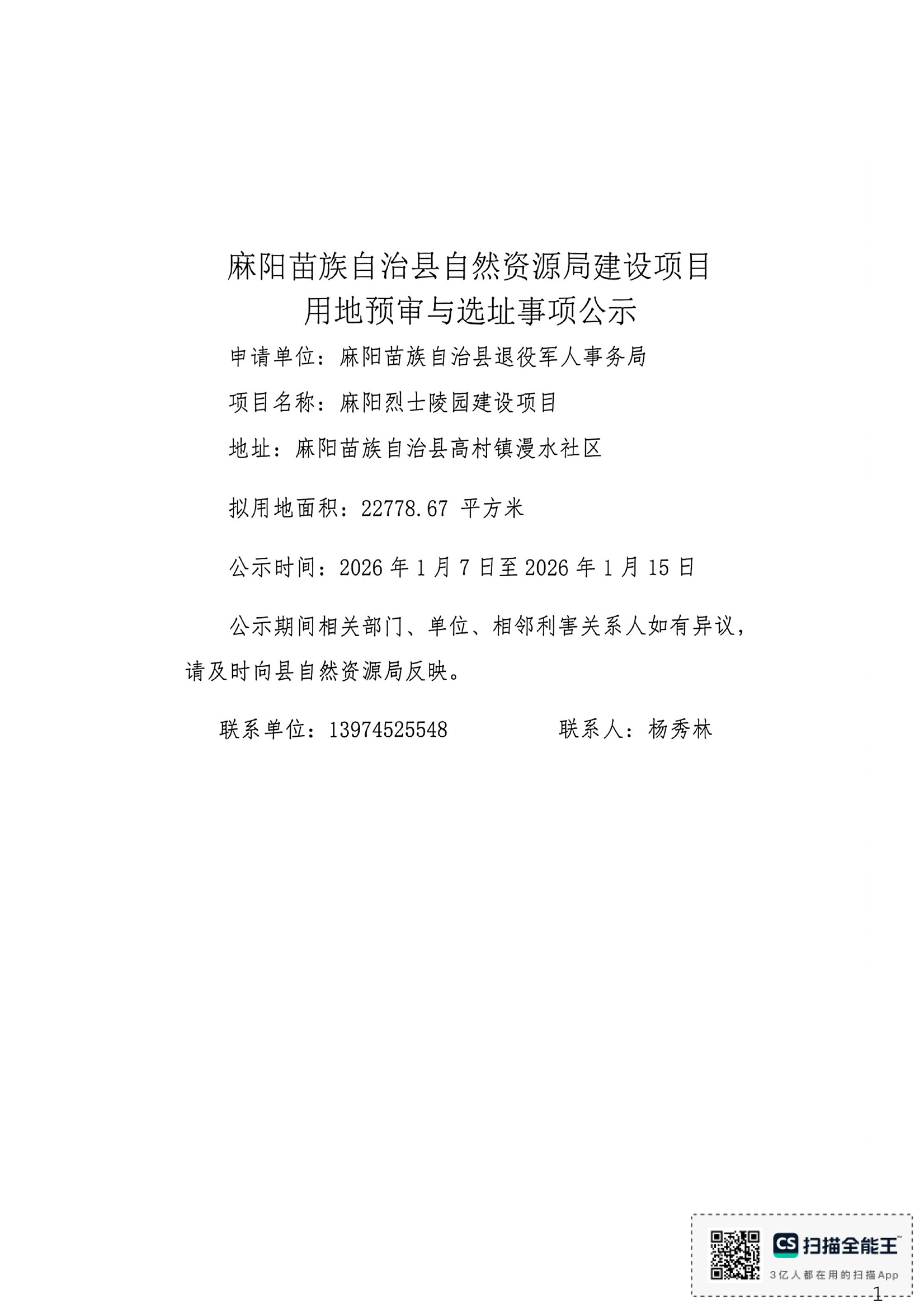 建设项目用地预审与选址事项公示(麻阳烈士陵园)