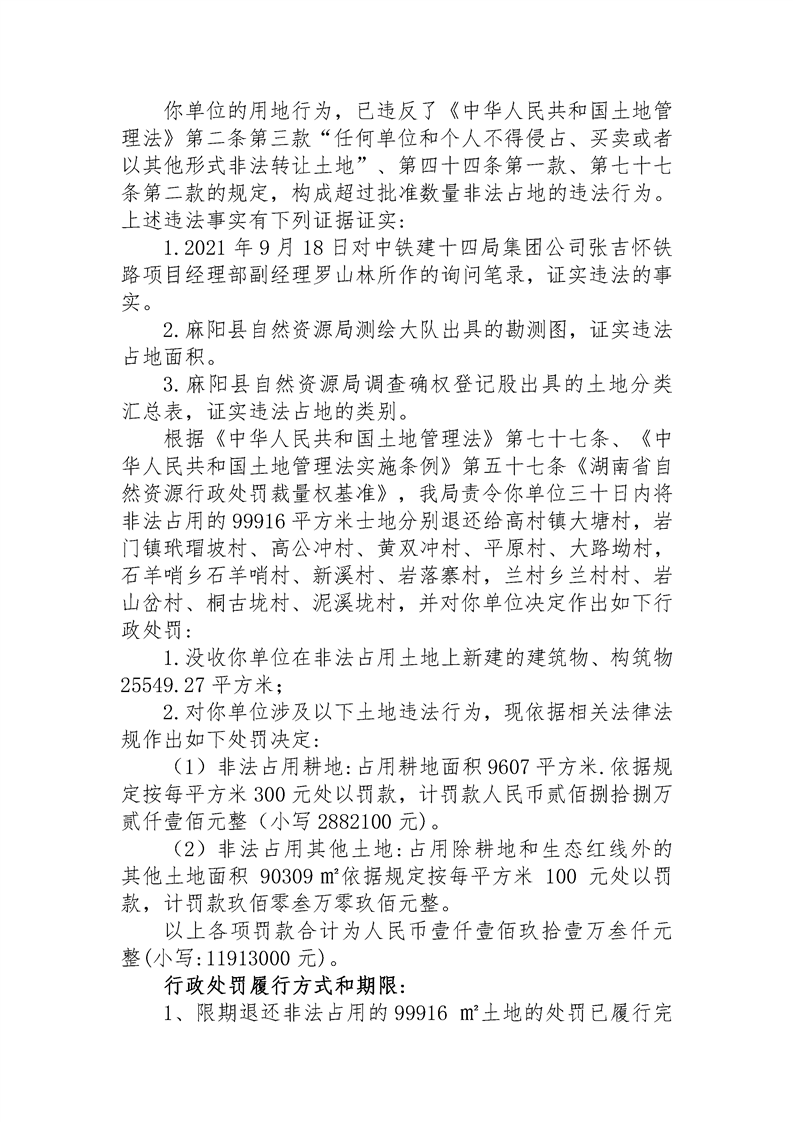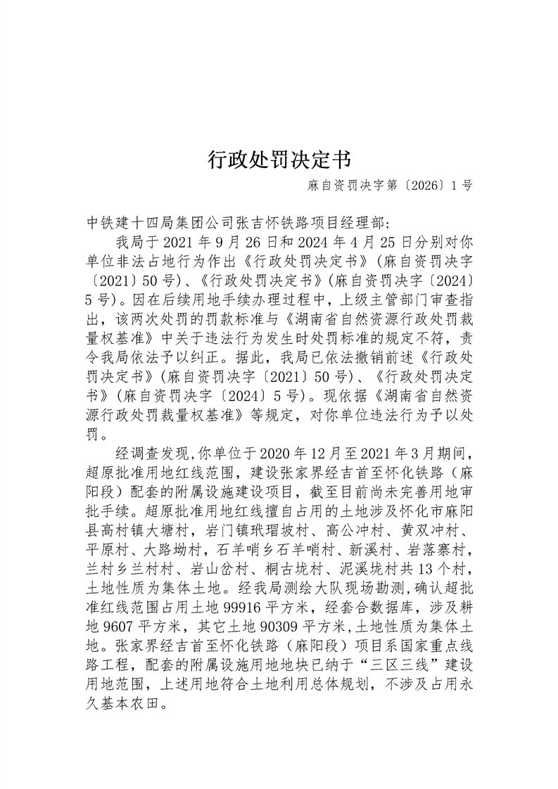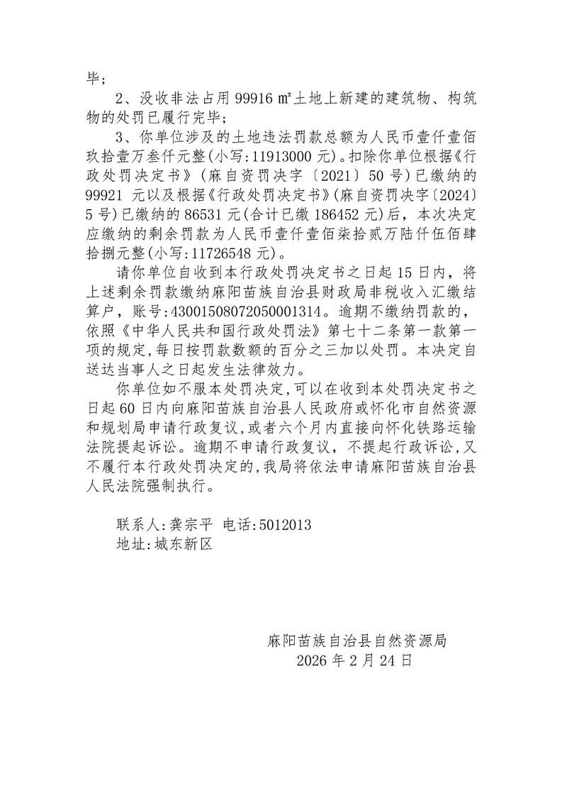 行政处罚决定书(麻自资罚决字第〔2026〕1号) 麻阳苗族自治县人民政府 http://www.mayang.gov.cn 发布时间: 2026-03-02 15:06 【字体:大 小】 分享到 来源:麻阳县自然资源局 作者: