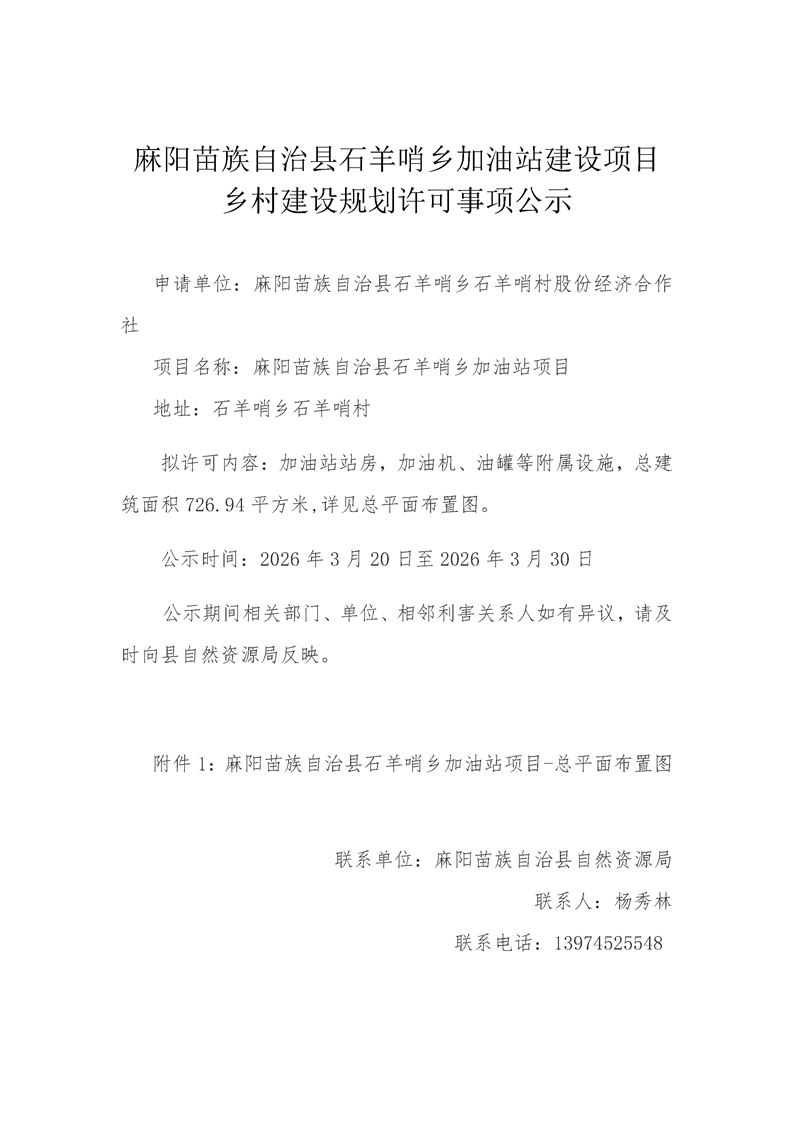 石羊哨乡加油站建设项目乡村建设规划许可事项公示 麻阳苗族自治县人民政府 http://www.mayang.gov.cn 发布时间: 2026-03-20 15:38 【字体:大 小】 石羊哨乡加油站总平面图 分享到 来源:麻阳县自然资源局 作者: