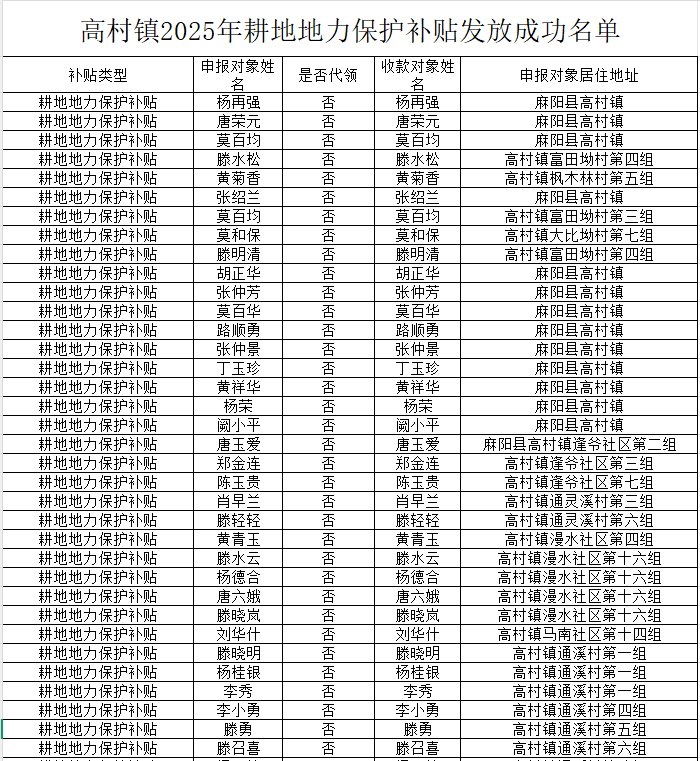 【涉农补贴】高村镇2025年耕地地力保护补贴发放成功名单 麻阳苗族自治县人民政府 http://www.mayang.gov.cn 发布时间: 2026-01-29 17:01 【字体:大 小】 备注:正文只展示部分信息,完整信息请下载附件浏览 附件:【涉农补贴】高村镇2025年耕地地力保护补贴发放成功名单 分享到 来源:麻阳县高村镇 作者: