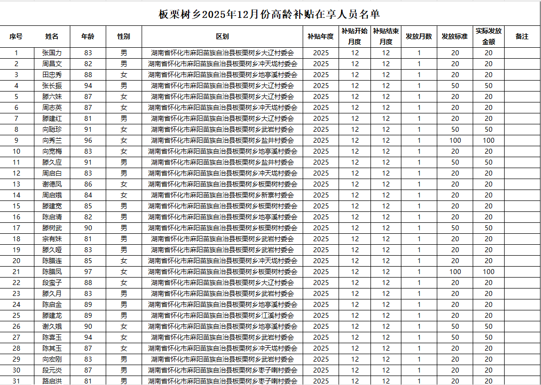 【社会救助】板栗树乡2025年12月份高龄补贴在享人员名单 麻阳苗族自治县人民政府 http://www.mayang.gov.cn 发布时间: 2026-01-04 10:42 【字体:大 小】 备注:正文只展示部分信息,完整信息请下载附件浏览 附件:【社会救助】板栗树乡2025年12月份高龄补贴在享人员名单 分享到 来源:麻阳县板栗树乡 作者: