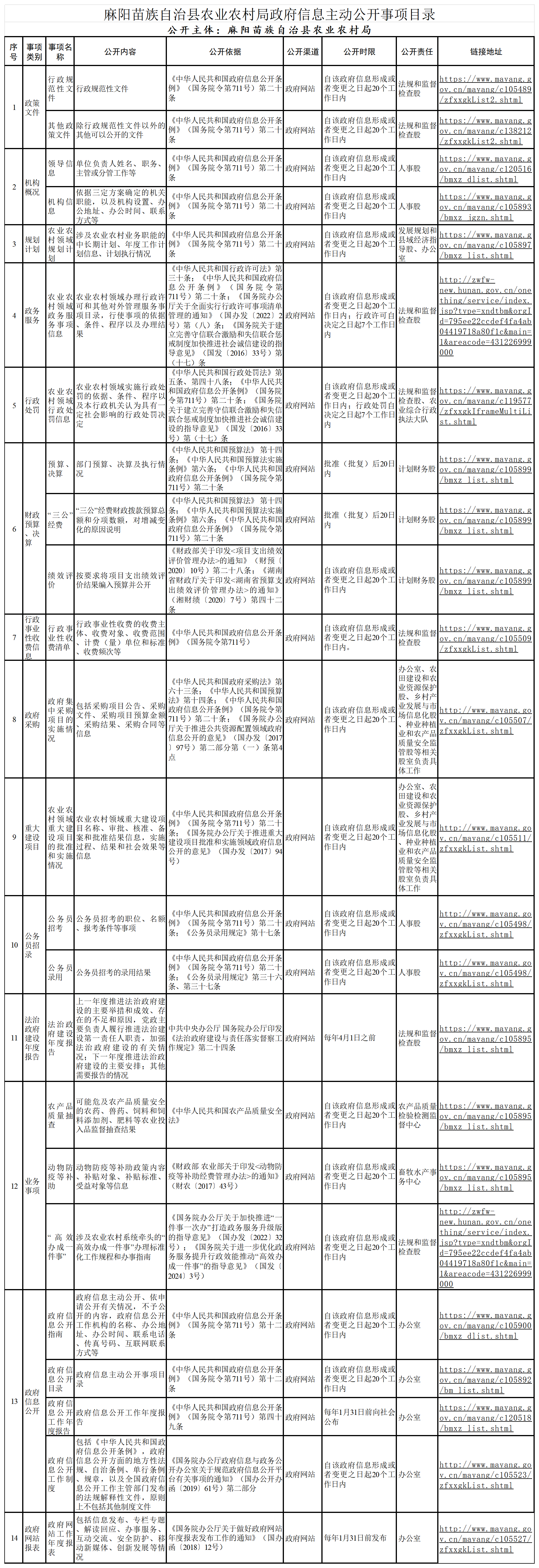 麻阳苗族自治县农业农村局政府信息主动公开事项目录 麻阳苗族自治县人民政府 http://www.mayang.gov.cn 发布时间: 2025-12-23 09:21 【字体:大 小】 相关附件 展开 麻阳苗族自治县农业农村局政府信息主动公开事项目录.xlsx 分享到 来源:麻阳县农业农村局 作者:
