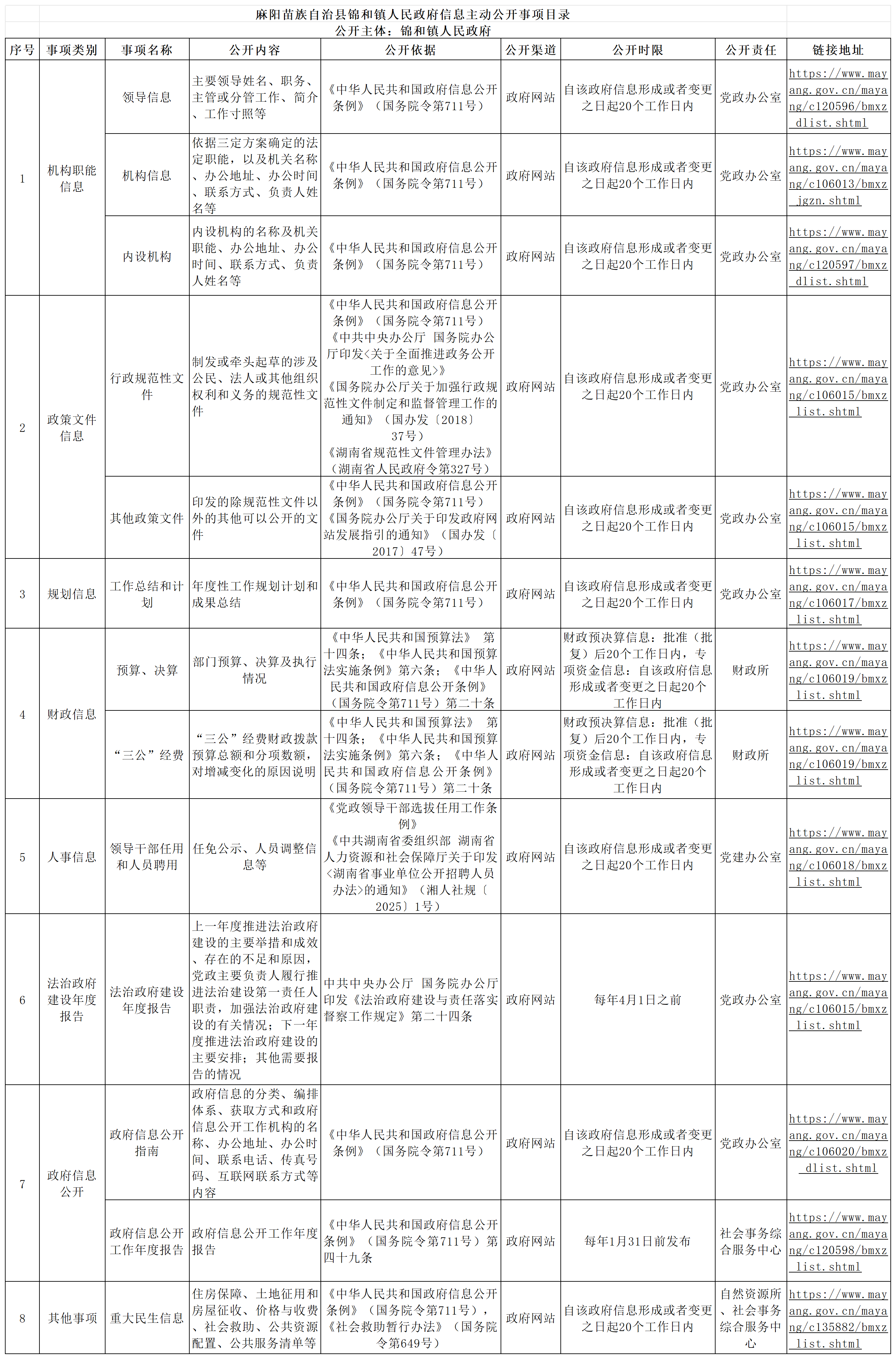麻阳苗族自治县锦和镇人民政府信息主动公开事项目录 麻阳苗族自治县人民政府 http://www.mayang.gov.cn 发布时间: 2026-01-29 11:15 【字体:大 小】 相关附件 展开 麻阳苗族自治县锦和镇人民政府信息主动公开事项目录.xlsx 分享到 来源:麻阳县锦和镇 作者: